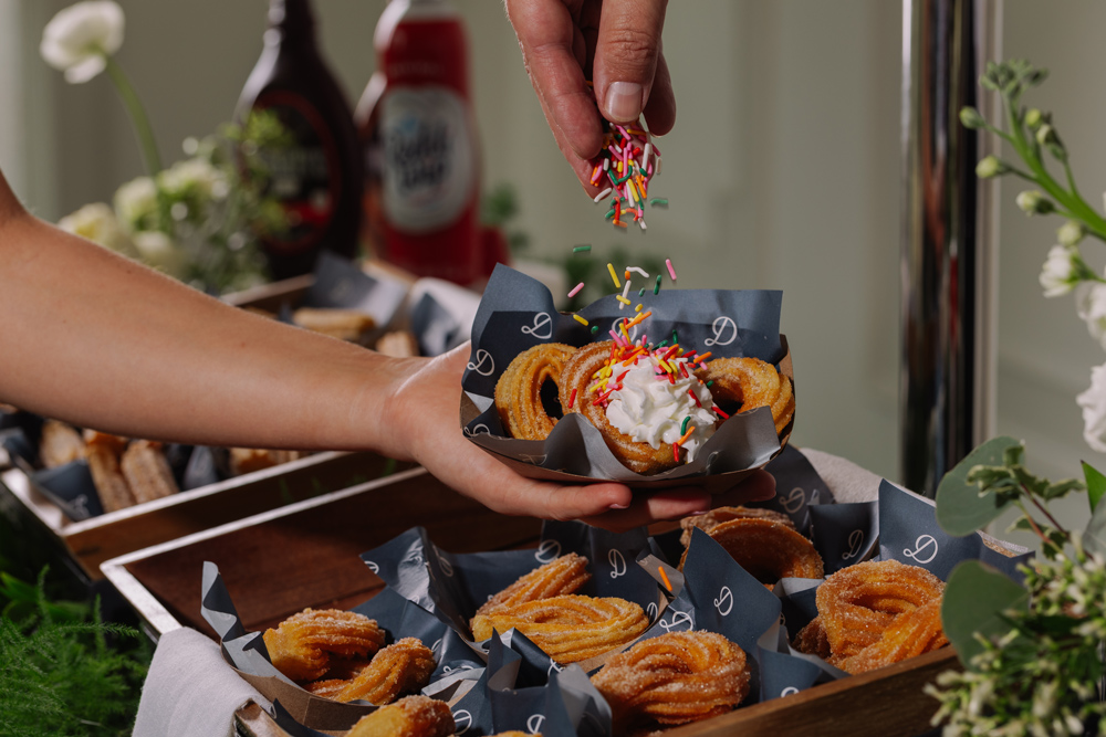 And the Churro Station brings cinnamon sugar churro loops and dipping sticks paired with spiced chocolate ganache, salted caramel, whipped cream, and extra cinnamon sugar. It is vibrant, interactive, and perfect for guests who want something sweet in hand as they head back to the dance floor.